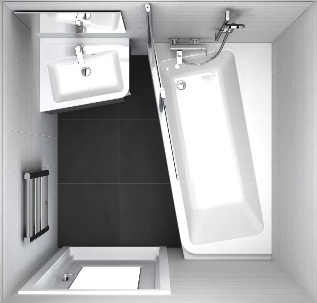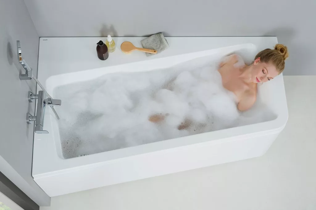 Az aszimmetrikus 10° fürdőkád a sarokba illik és kissé ferde. A tervező, Kryštof Nosál, egy téglalap alakú kádat vett és 10 fokkal elforgatta. Az új szög nem csak esztétikus, hanem praktikus is - több tárolóhelyet biztosít. Bal oldali változat.
