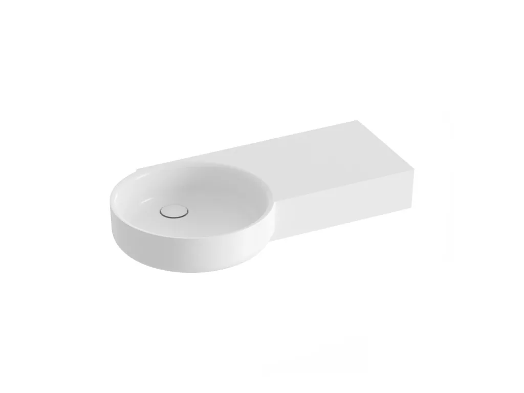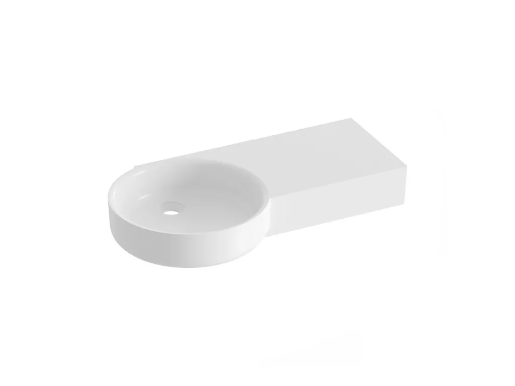 Öntött márvány ARC mosdó falra szerelhető kivitelben, önállóan vagy az ARC kád fölé történő telepítéshez, túlfolyó nélkül. Fehér kivitel. Jobb oldali változat. Csaptelep-furat nélkül – falba süllyesztett mosdócsapteleppel való kombináláshoz.