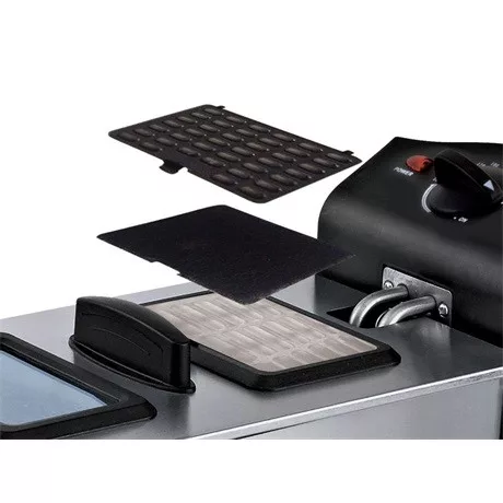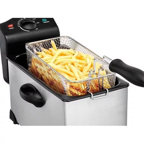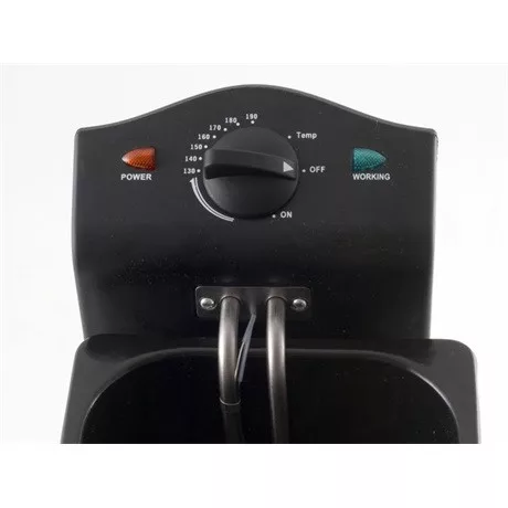 Praktikus, teljesen kivehető elektromos olajsütő, amely külső acél testből és hőszigetelt fogantyúkból, zománcozott tartályból és 3,5 literes rozsdamentes acél kosárból áll. Fedő szűrővel, fogantyúval és lőrésszel a főzés ellenőrzéséhez. Piros és zöld működési lámpával a hőmérséklet eléréséhez, praktikus gombról állítható 190°C-ig. Stabil csúszásmentes lábakkal és belső kábeltároló rekesszel.