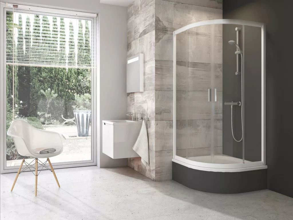 Négyrészes, negyedköríves Blix zuhanykabin fehér színben, átlátszó, edzett, biztonsági üveggel és Ravak AntiCalc® vízlepergető réteggel. Tolóajtós rendszer.