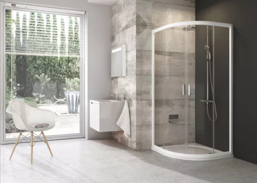 Négyrészes, negyedköríves Blix zuhanykabin fehér színben, átlátszó edzett, biztonsági üveggel és Ravak AntiCalc® vízlepergető réteggel. Tolóajtós rendszer.