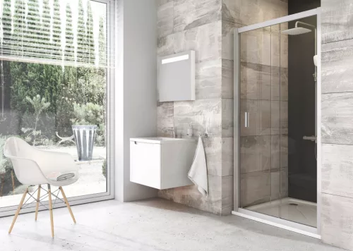 Blix kétrészes zuhanyajtó szatén kivitelben, átlátszó biztonsági üveggel és Ravak AntiCalc® vízlepergető réteggel. Tolóajtós rendszer. Forgatható termék bal és jobb oldali változat kialakításához.