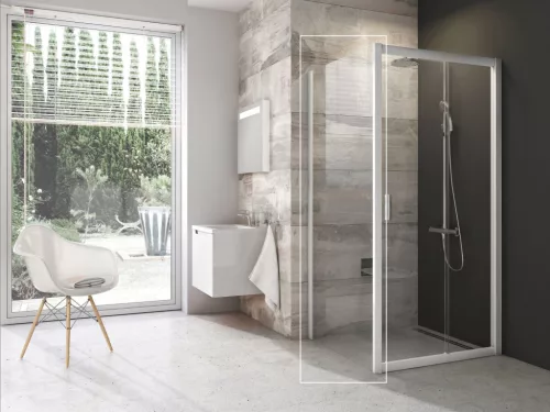Blix egyrészes fix fal, fehér kivitelben, átlátszó biztonsági üveggel és Ravak AntiCalc® vízlepergető réteggel. Forgatható termék bal és jobb oldali változat kialakításához.