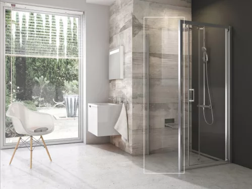 Blix egyrészes fix fal, krómhatású kivitelben, átlátszó biztonsági üveggel és Ravak AntiCalc® vízlepergető réteggel.