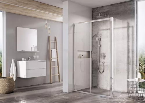 Blix Slim fix fal, fényes krómhatású kivitelben, átlátszó biztonsági üveggel és Ravak AntiCalc® vízlepergető réteggel. Forgatható termék bal és jobb oldali változat kialakításához.