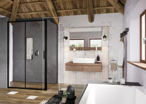 Blix Slim fix fal, fekete kivitelben, átlátszó biztonsági üveggel és Ravak AntiCalc® vízlepergető réteggel. Forgatható termék bal és jobb oldali változat kialakításához.