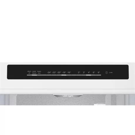 • Kezelő- és jelzőelemek: Fagyasztó hőmérséklet kijelzése, Fagyasztó super fokozat, Fagyasztótér figyelmeztető, Hangjelzés: ajtó nyitva, Hangjelzés hiba esetén, Hűtő hőmérséklet kijelzése, Hűtő super fokozat