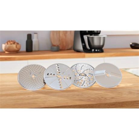 • Alaptartozékok: 1 x Fedél, 1 x Szeletelőfeltét, 1 x Nemesacél keverőtál, 1 x Húsdaráló, 1 x Fém dagasztóbetét, 1 x Turmixkehely, műanyag, 1 x Megfordítható reszelőkorong, 1 x Reszelőkorong, durva, 1 x Reszelőkorong, középfinom, 1 x Megfordítható szeletelőkorong