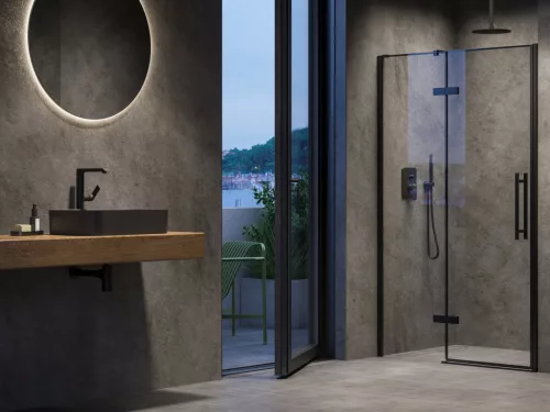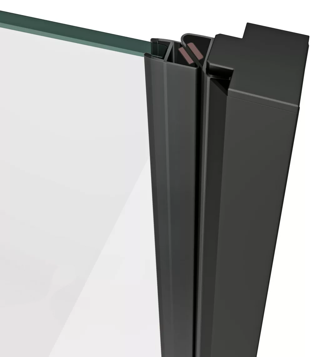 Cool! kétrészes zuhanyajtó fekete kivitelben, átlátszó biztonsági üveggel és Ravak AntiCalc® vízlepergető réteggel. Zsanéros nyíló rendszer. Forgatható termék bal és jobb oldali kivitel kialakításához.