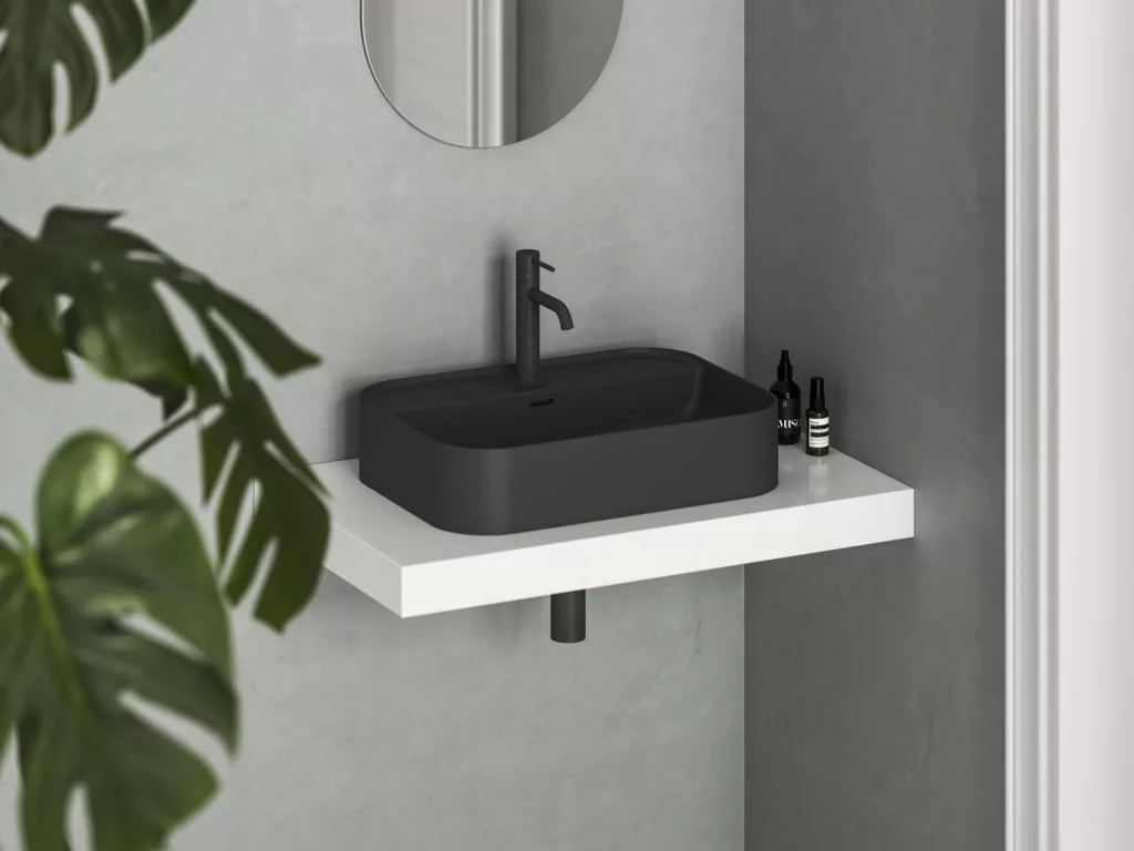 Vékony falú kerámia mosdó Ceramic Slim asztalra vagy szekrényre történő beépítéshez, túlfolyóval. Matt fekete kivitelben.