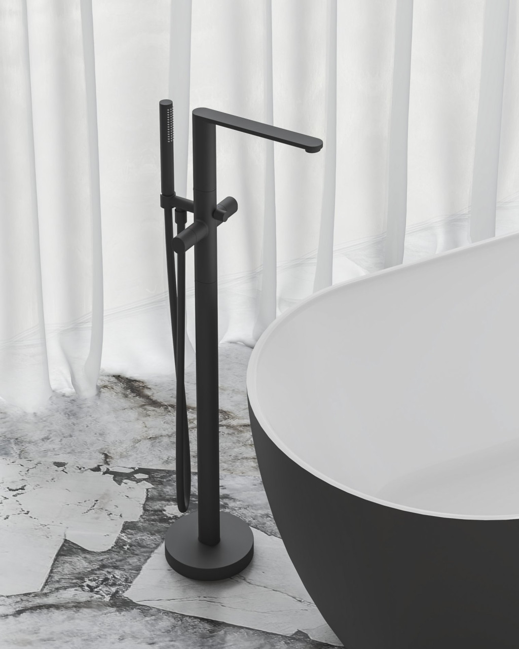 Chrome II padlóba építhető kádcsaptelep zuhanyszettel, R-boxhoz tervezve. Fekete kivitelben.