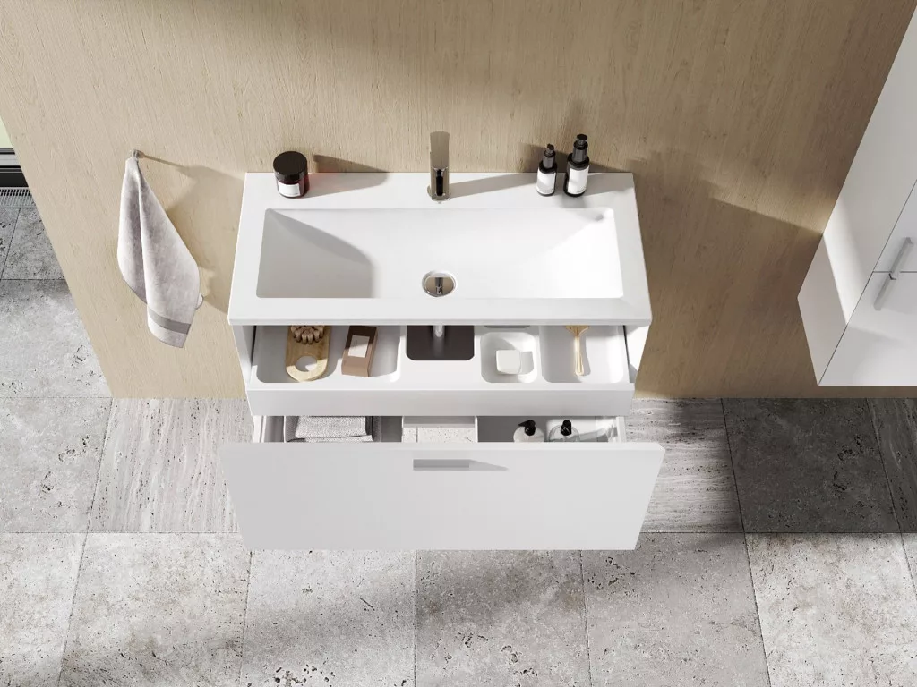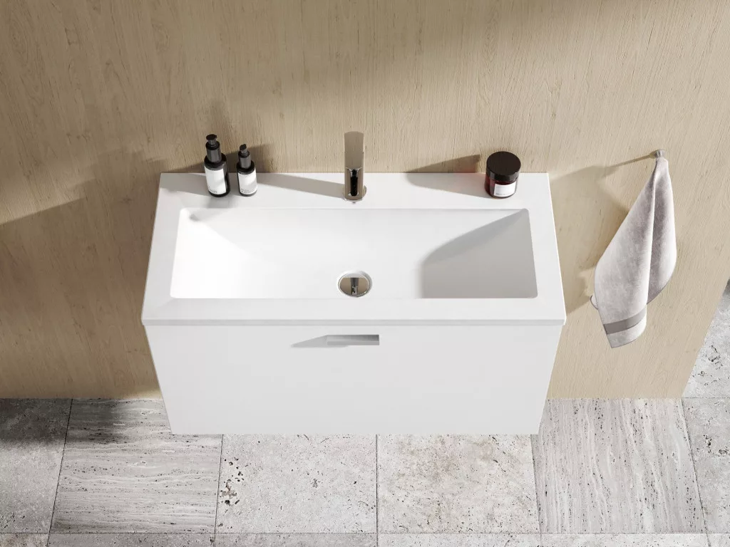 Clear öntött márványból készült bútorba süllyeszthető mosdó, túlfolyó nélkül. Fehér kivitelben.