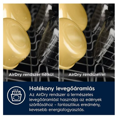 Az AirDry rendszerű mosogatógépek ajtaja 10 cm-re kinyílik az utolsó szárítási fázisban. Az edényeket a természetes levegőáramlás segítségével, energiatakarékosan szárítja meg a készülék.