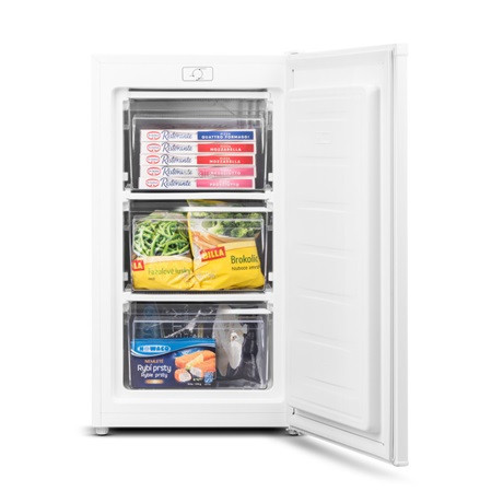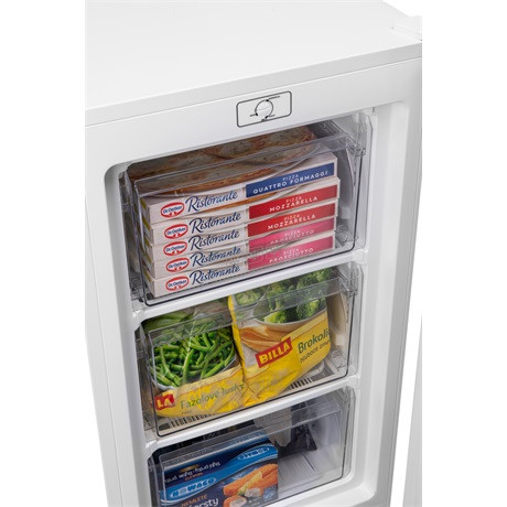 A három átlátszó fiók garantálja az élelmiszerek tiszta tárolását. A mechanikus szabályozás nagyon egyszerű, a termosztát segítségével könnyedén beállíthatja a kívánt hőmérsékletet. A fagyasztó a rendkívül hatékony négycsillagos fagyasztási osztályba tartozik, akár 2,8 kg élelmiszert fagyaszt le 24 óra alatt, és akár 7,5 órán keresztül is tele van vele. áramkimaradásról befagyott.