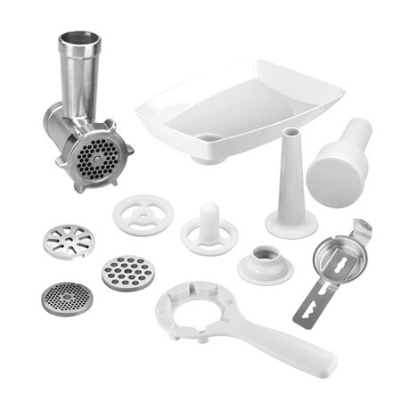 * Húsdaráló 62 mm átmérővel (4 méretű daráló lap, kolbászfélék készítő tartozék, Kebbe húscsövek készítő tartozék, sütemény formázó, töltőeszköz, beöntő, kioldó kulcs)