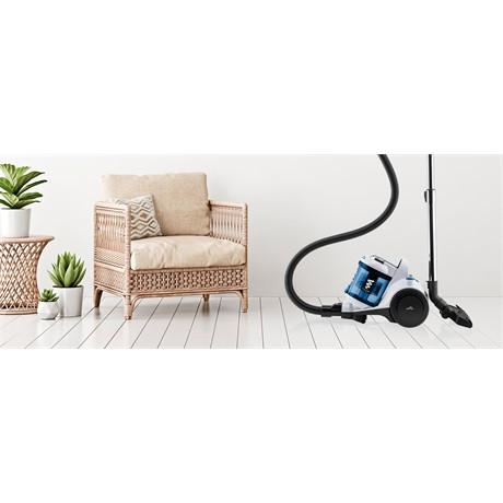 A porzsákot egy 1,5 literes átlátszó tartály helyettesíti, amely hatékonyan gyűjti össze a szennyeződéseket. A porszívó 8 méteres hatótávolsága minden háztartás számára ideális, míg az ergonomikus kialakítású fogantyú gondoskodik otthona kényelmesebb tisztításáról.