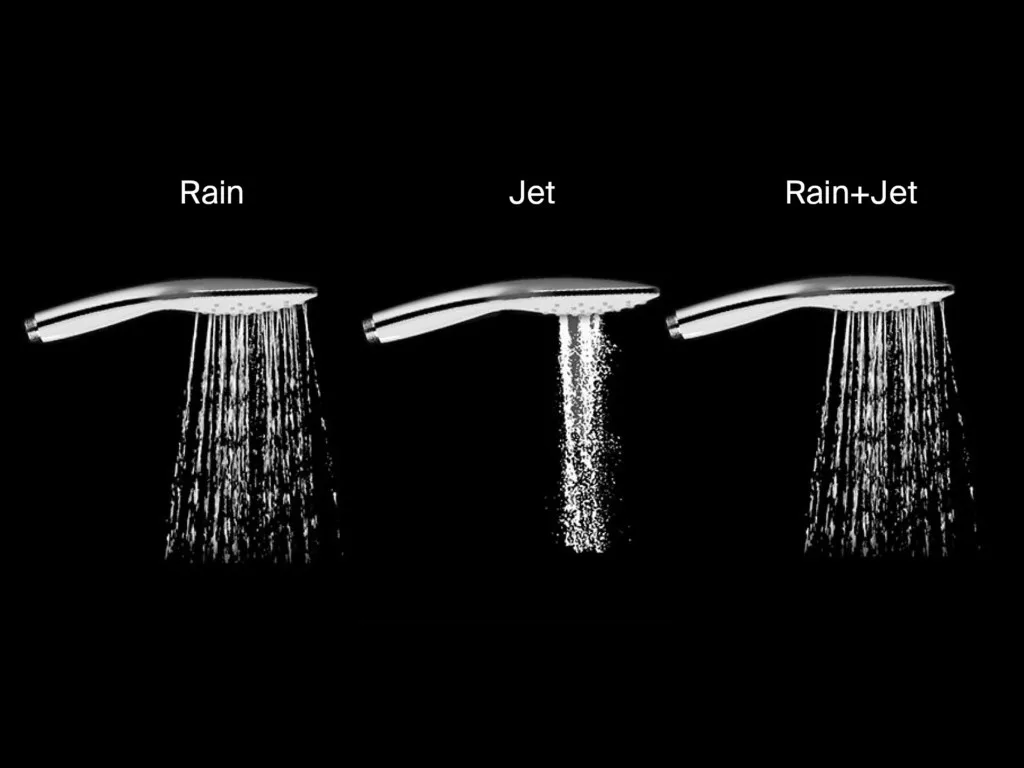 A háromfunkciós zuhany modern kialakítása bármely fürdőszobának elegáns megjelenést kölcsönöz. A Rain üzemmód lágy, nyári zápor érzetét kelti és nyugtató hatású a bőrre. A Jet funkció erőteljes vízsugarat biztosít a zuhanyfej közepéből, amely intenzíven élénkíti és masszírozza a bőrt, valamint a nehezen hozzáférhető részek tisztításához is ideális. A harmadik funkció a két üzemmód kombinációját kínálja.