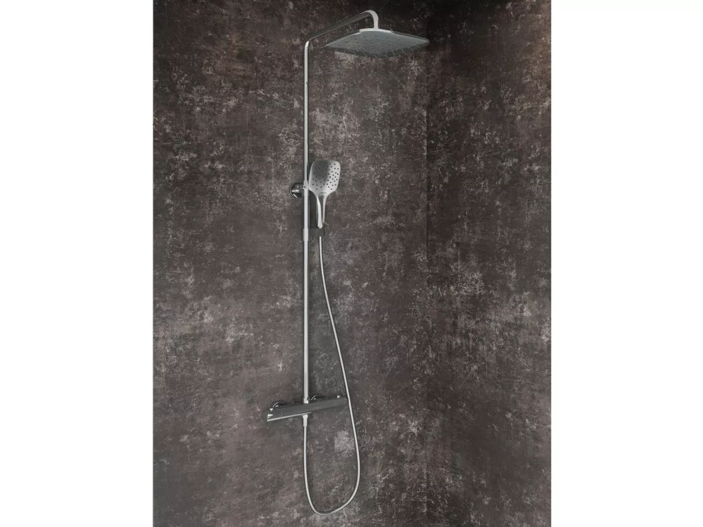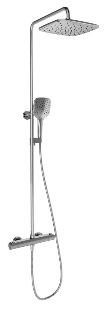 Flat termosztatikus, csúszó zuhanyoszlop zuhanykészlettel. Króm fényes kivitelben.