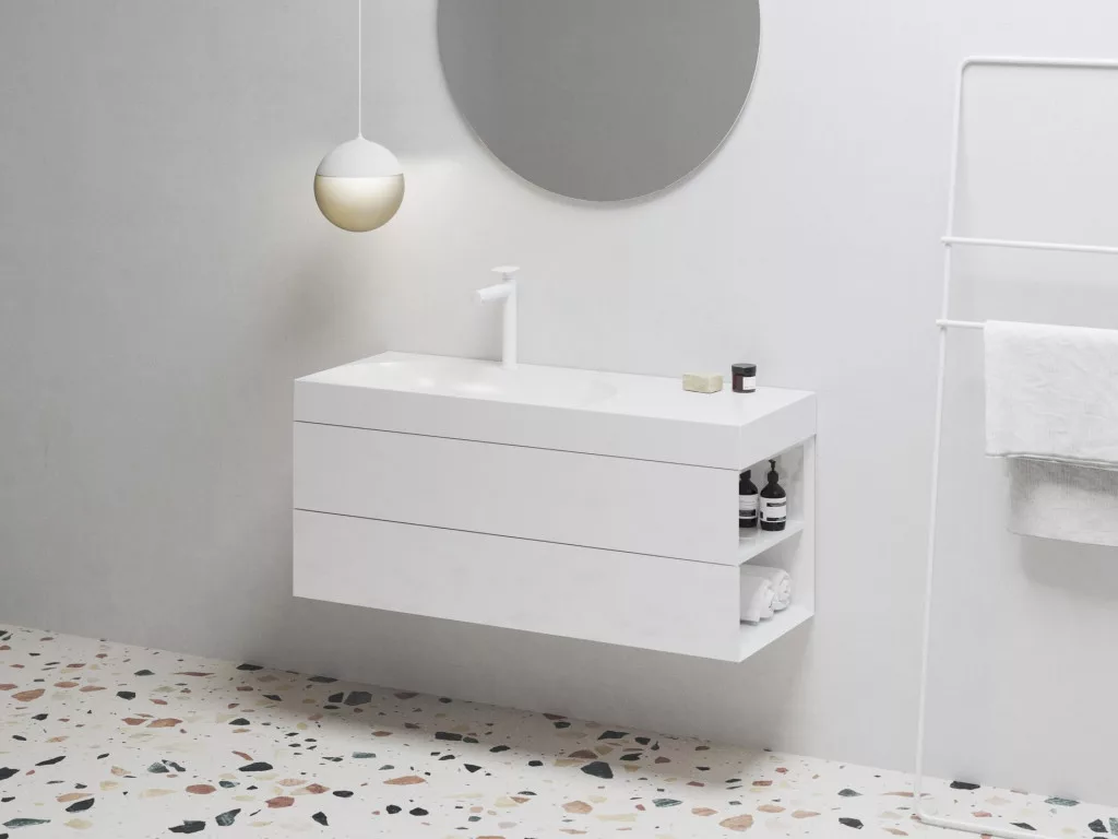 Öntött márvány Lite mosdó falra szerelhető vagy fali szekrénybe süllyesztve, túlfolyás nélkül. Fehér kivitelben. Jobb változat. Mosdócsaptelep furattal.