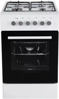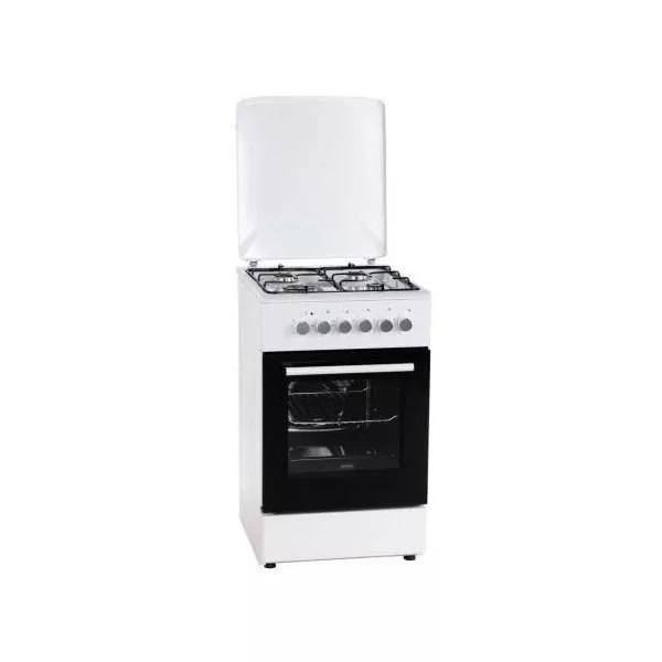 A kombinált tűzhely fehér színű, 4 gázégős, 2 darabból álló zománcozott rostéllyal. Gyújtógombos.