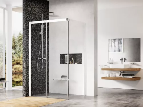 A termék egy kétrészes zuhanyajtóból (egy fix és egy mozgatható rész, amely egy tolóajtót alkot) és egy fix falból áll. A fürdőszoba csempézett sarkába, közvetlenül a padlóra telepíthető zuhanyfolyókával vagy padlóösszefolyóval.