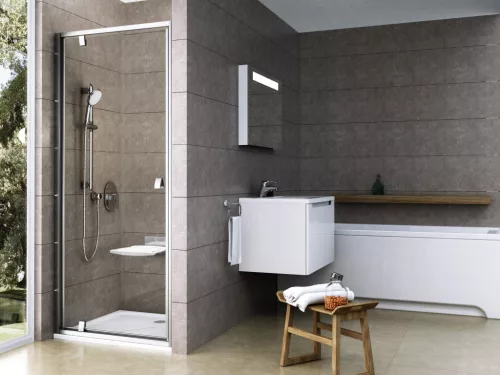 Egyrészes Pivot zuhanyajtó szatén kerettel, fogantyúkkal és zsanérokkal. A betétlemez Ravak AntiCalc® vízlepergető réteggel ellátott, átlátszó biztonsági üvegből készült. Pivot forgózsanéros nyílórendszer. Forgatható termék, bal és jobb oldali kivitel kialakításához.