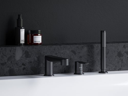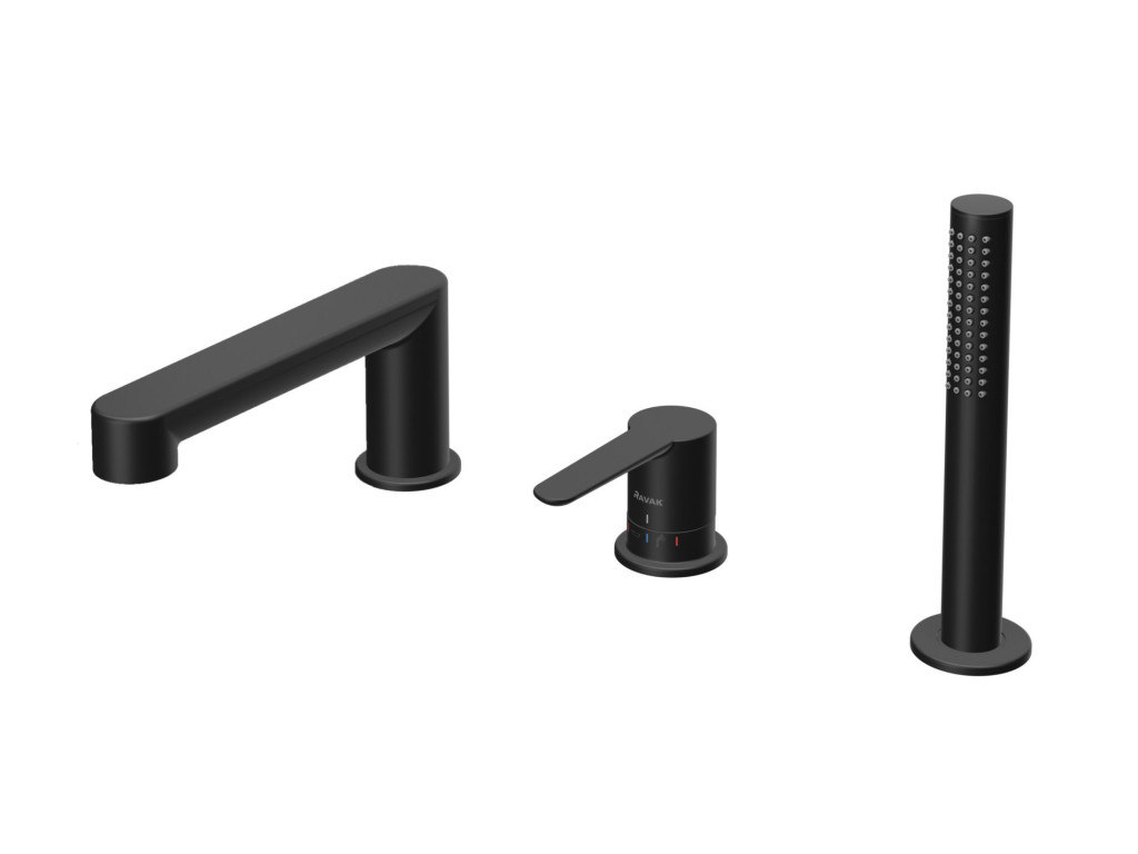 Kád álló 3 lyukú csaptelep Puri forgó váltóval, zuhanykészlettel. Matt fekete kivitelben. Amíg a készlet tart.