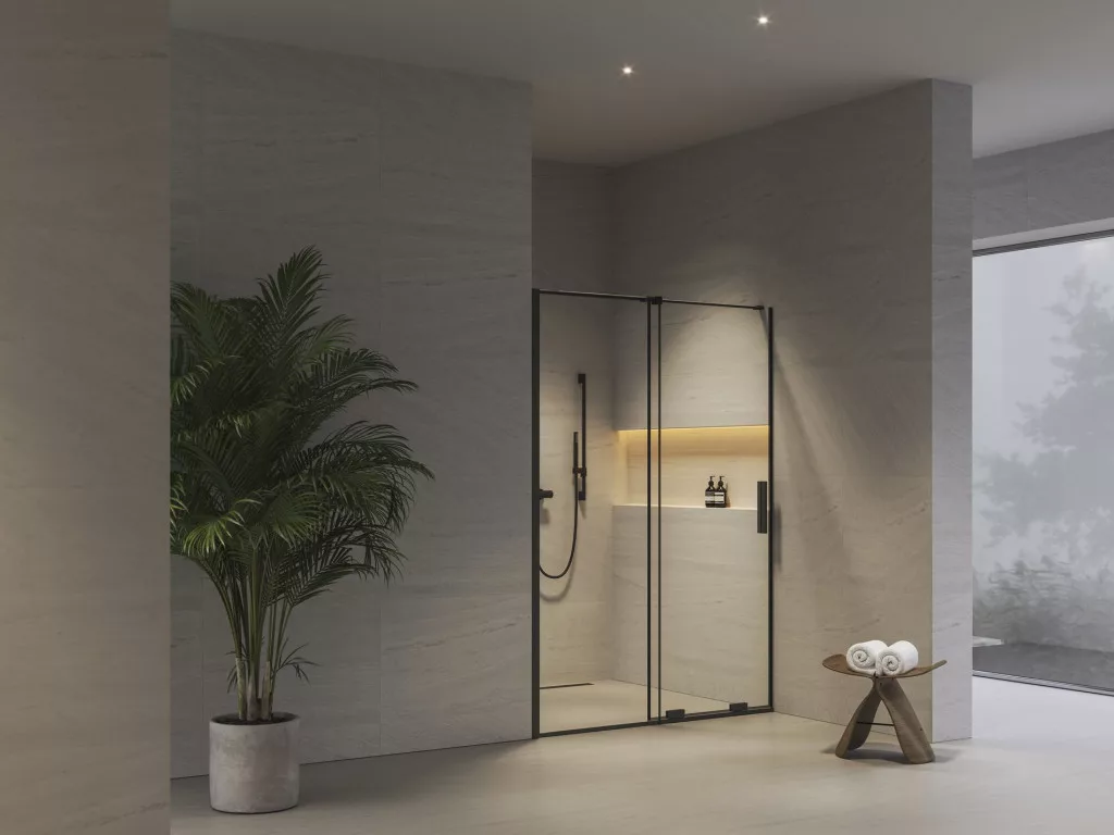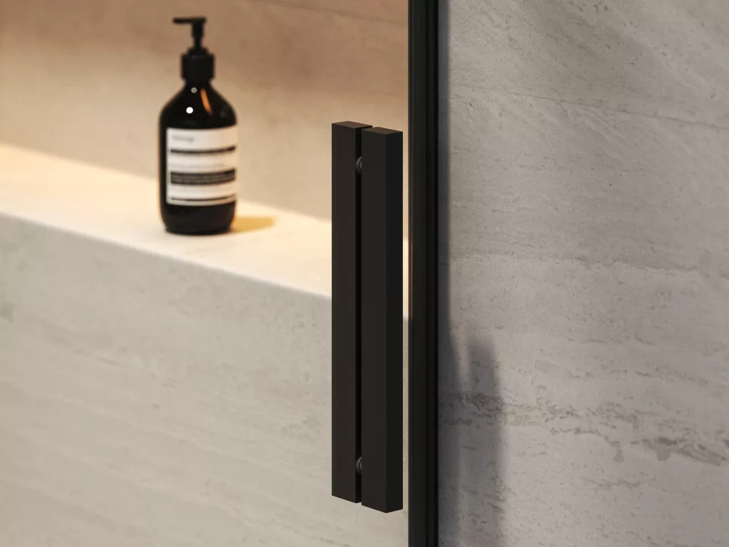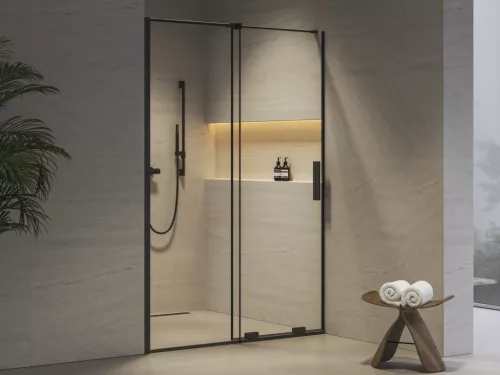 Kétrészes Roll zuhanyajtó fekete kivitelben, Ravak AntiCalc® védőréteggel ellátott, átlátszó üveg betéttel. Toló rendszerű nyitás. Megfordítható kivitel, bal- és jobbos változatban is beépíthető.