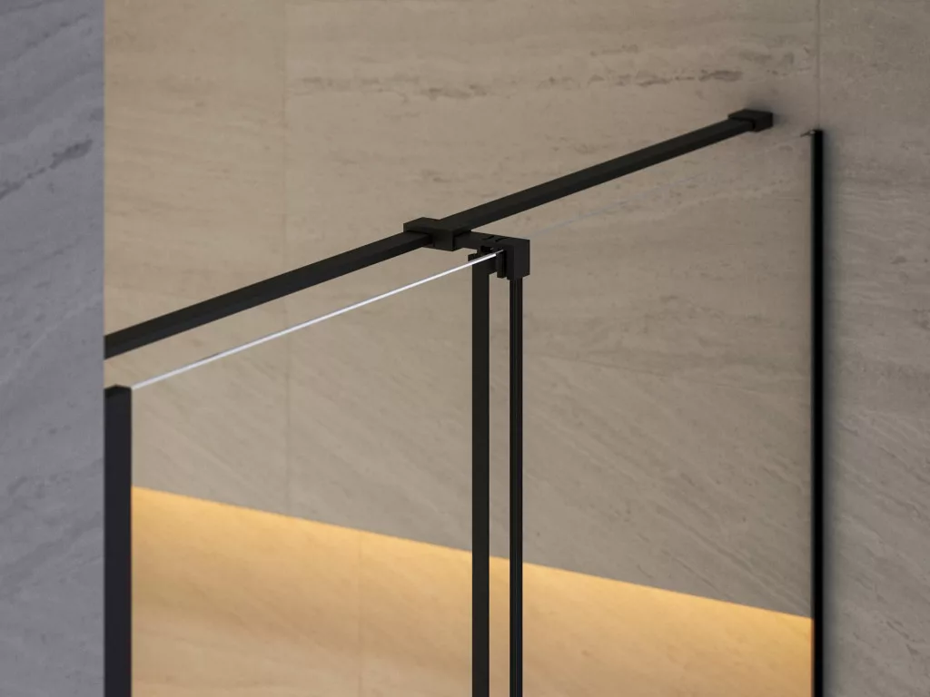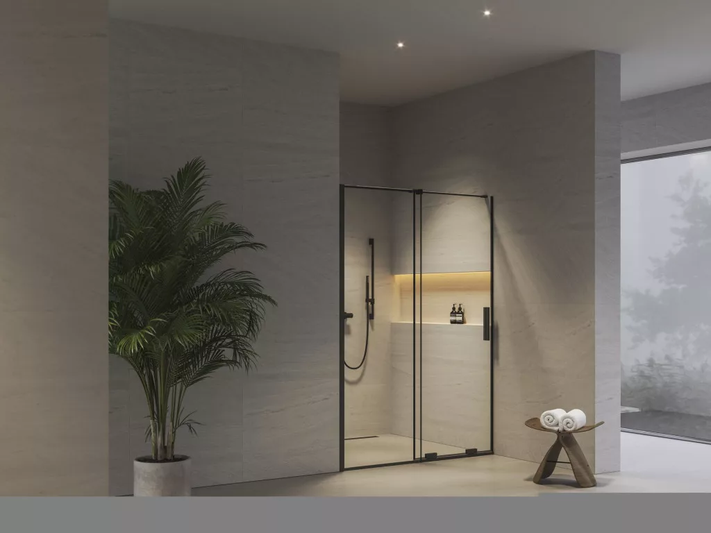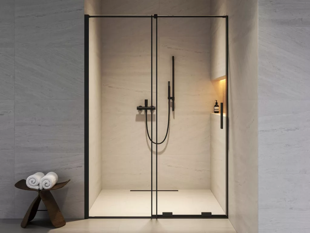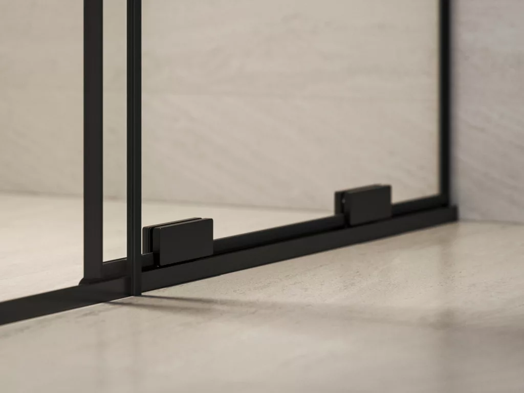Kétrészes Roll zuhanyajtó fekete kivitelben, Ravak AntiCalc® védőréteggel ellátott, átlátszó üveg betéttel. Toló rendszerű nyitás. Megfordítható kivitel, bal- és jobbos változatban is beépíthető.