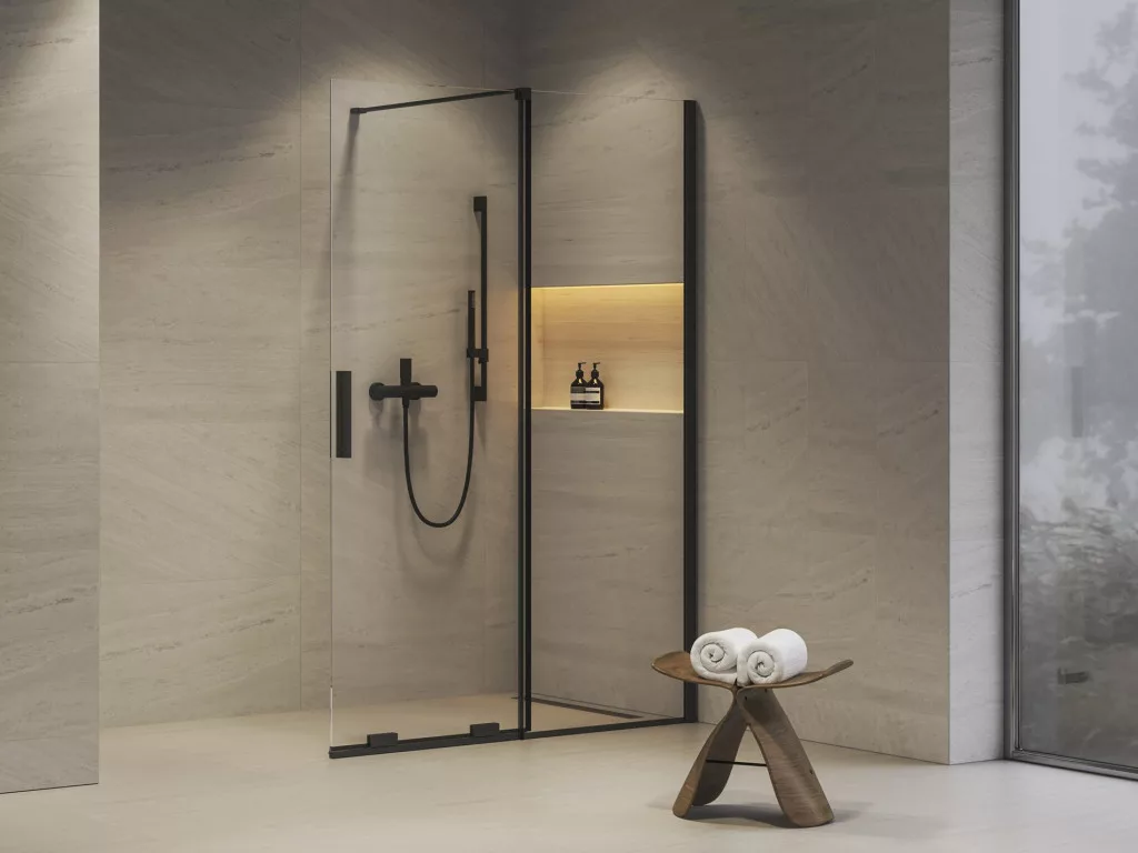 Kétrészes Walk-In Roll zuhanykabin egyik oldalról nyitott belépéssel, toló paravánnal. Fekete kivitelben, Ravak AntiCalc® védőréteggel ellátott, átlátszó üveg betéttel. Megfordítható kivitel, bal- és jobbos változatban is beépíthető.