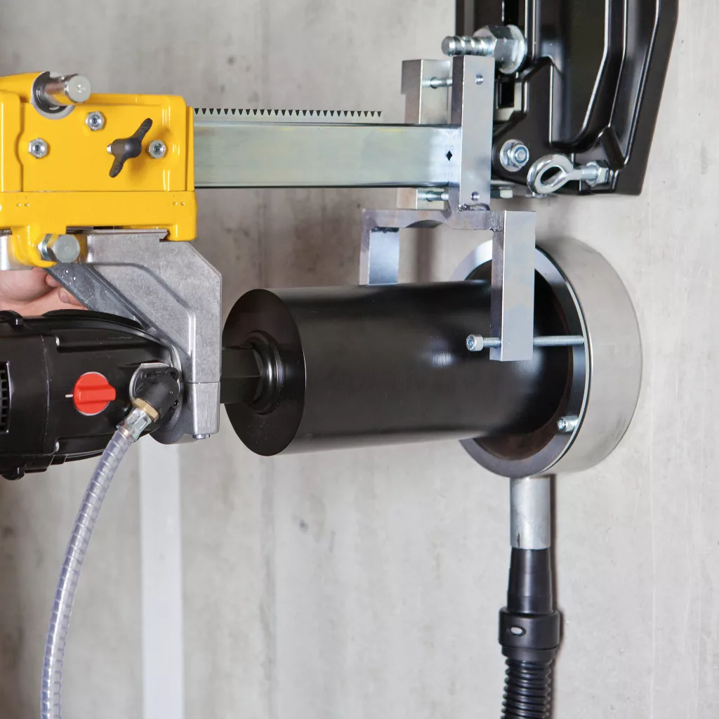 Vízelszívó berendezés nedves fúráshoz 170 mm átmérőig, amely nyomógyűrűs vízgyűjtő gyűrűből, 200 mm átmérőjű gumitárcsából és univerzális leszorítóból áll minden REMS fúróállványhoz.