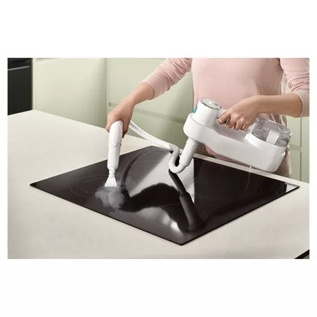 A kivehető kézi egység és a hozzá tartozó tartozékok (poliamid kefe, sárgaréz körkefe, mini kaparó, réskefe) segítségével még a legnehezebb szennyeződéseket is eltávolíthatod, mint például a vízkő, zsíros lerakódások, vagy a főzőlapra égett ételmaradékok. A hosszabbító tömlő révén a nehezen elérhető helyek is könnyen tisztíthatóvá válnak.