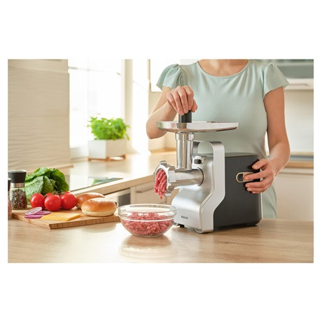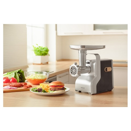 A Sencor SMG 6400SL húsdaráló ideális eszköz különböző húsok gyors és egyszerű darálásához a masszív acélból készült vágóéleknek és vágótárcsáknak, valamint a nagy teljesítményű motornak köszönhetően. Egy perc alatt akár 2,2 kg húst is ledarálhatsz a háromféle vágótárcsa segítségével finomra, közepesre vagy durvára. A különleges tartozékok segítségével gyümölcslevet, jam-et vagy saját házi kolbász is készíthető vele. A daráló, reszelő tartozékokkal egyszerűen reszelhetsz sajtot vagy különböző zöldségeket is egyaránt. Használatában segít a visszafelé is működő motor. Használaton kívül a vezetéket a darálón található kábeltartóban tárolhatod, a biztonságos használatot pedig a csúszásgátló lábak biztosítják.