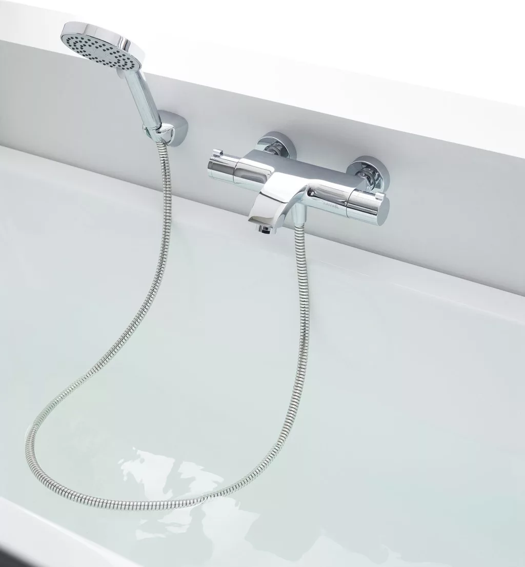 Termosztátos fali kádcsaptelep zuhanyszett nélkül. Króm változatban. Állandó vízhőmérséklet beállítása.