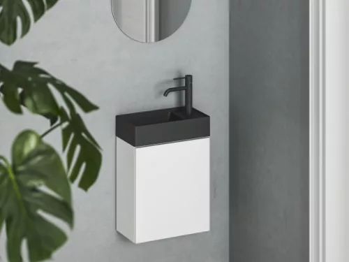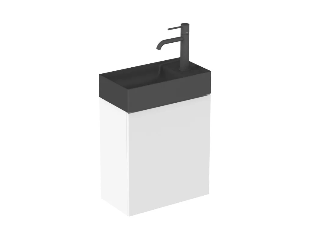 Vékony falú kerámia mosdó Veda Slim, függesztett szekrénybe süllyeszthető, túlfolyó nélkül. Matt fekete kivitelben.