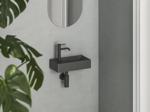 Kerámia mosdó Veda Wall, és falra kizárólag szerelhető, túlfolyó nélkül. Antracit kivitelben. Balos változat.