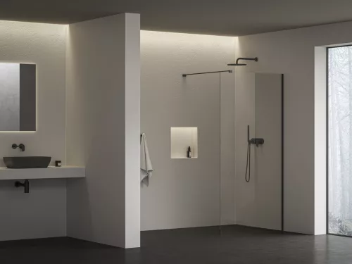 Walk-In Wall zuhanykabin az egyik oldalról nyitott bejárattal. Transparent betétlemez Ravak Anticalc® védőréteggel. Rögzítő profil fekete kivitelben.