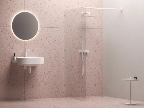 A Walk-In Wall zuhanykabin 8 mm vastag edzett biztonsági üvegből áll. A termék stabilitását egy fém merevítő biztosítja, amely meghatározza a belépés szélességét. A Walk-In Wall zuhanykabin fehér fém alkatrészekkel rendelkezik. Javasoljuk burkolt fürdőszoba sarokba történő telepítését, közvetlenül a padlóra, beépített padlóösszefolyóval vagy zuhanyfolyókával. A zuhanykabin univerzális, a beszereléskor választható jobb vagy bal oldali belépés. A csomag tartalmaz egy fix üvegfalat beállító profilt, fehér kivitelben.