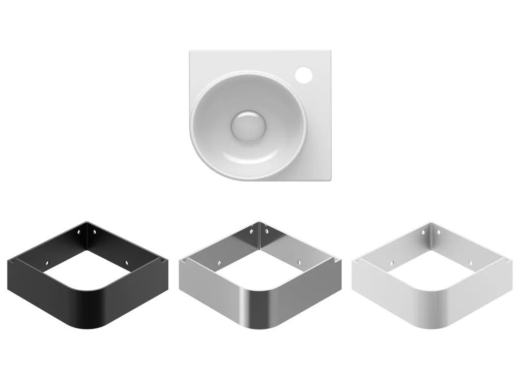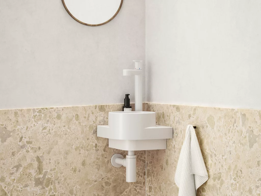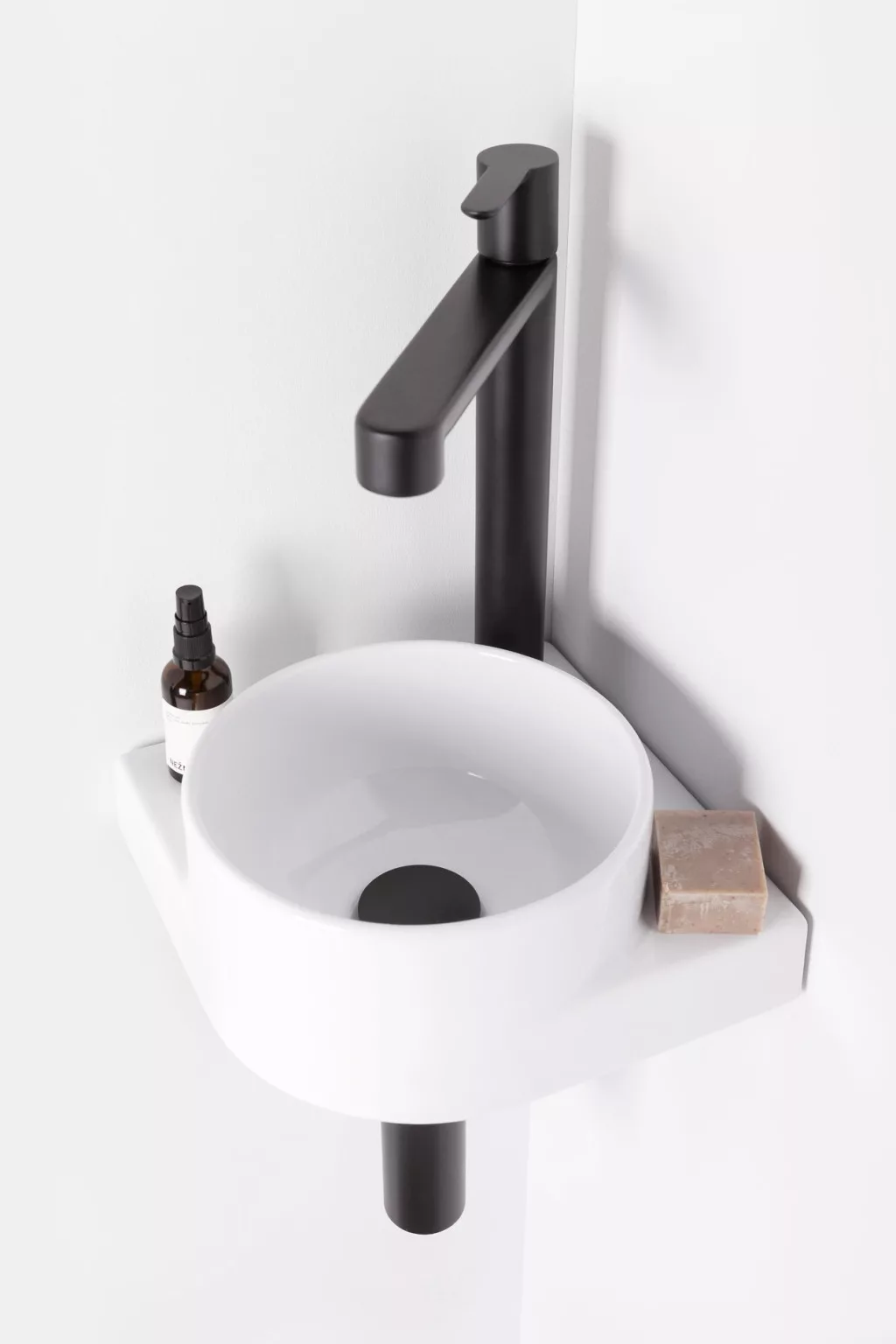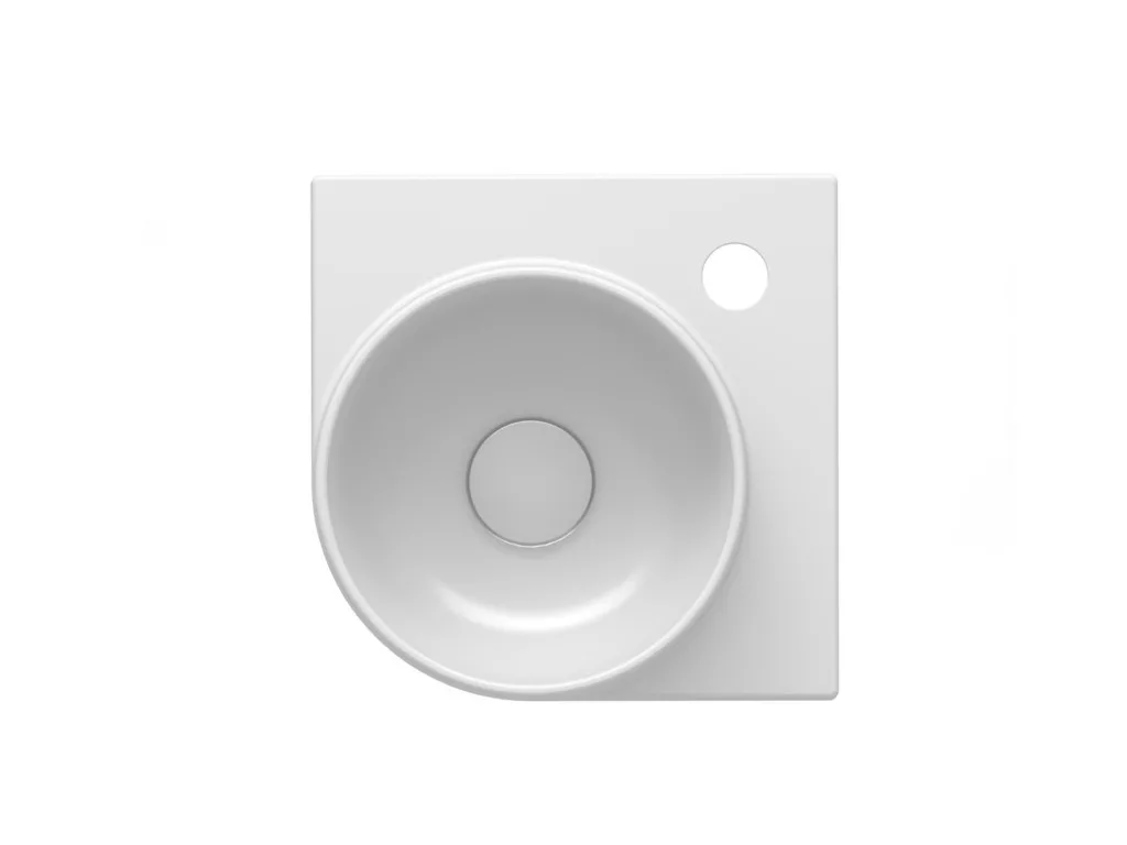 Vékony falú kerámia Yard sarokmosdó a Yard konzolra történő felszereléshez, túlfolyó nélkül. Fehér kivitel. Álló csaptelep furattal.