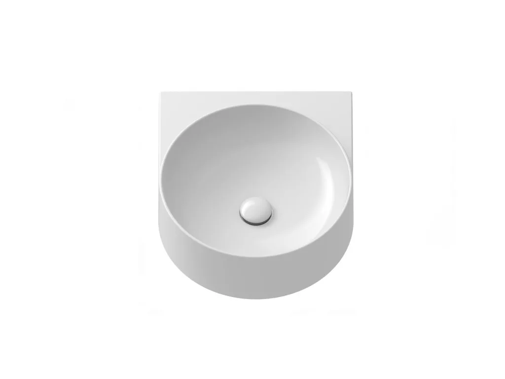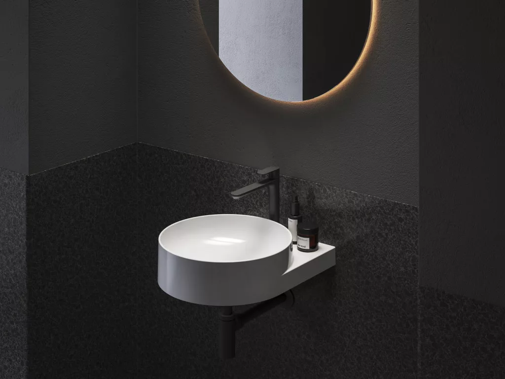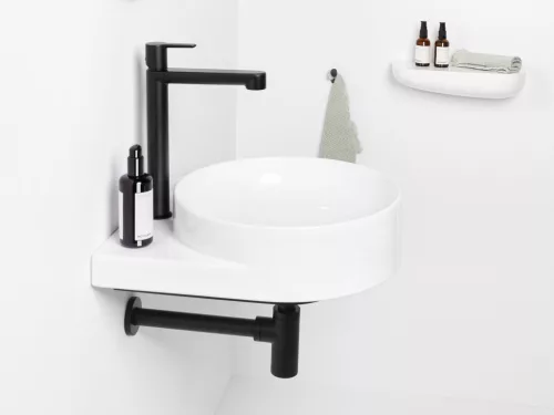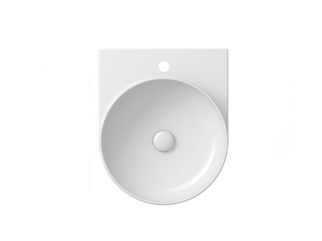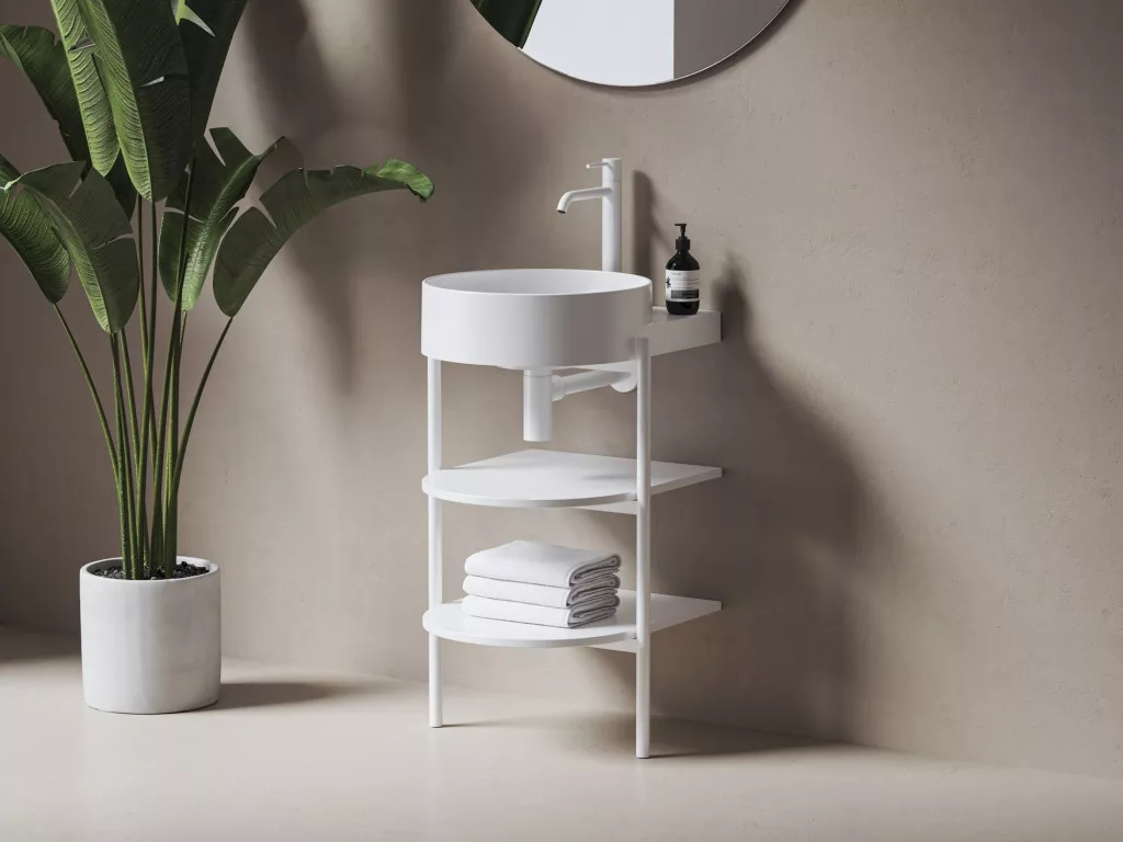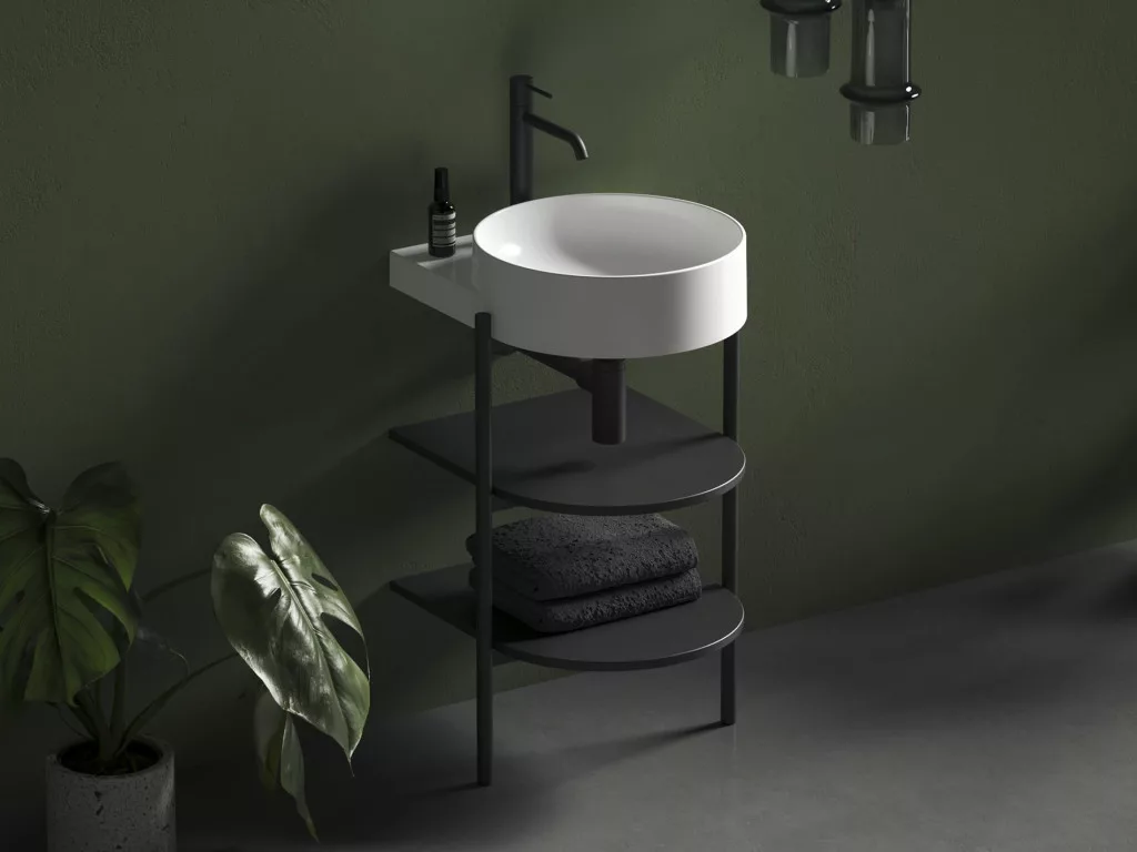 Vékonyfalú kerámia Yard mosdó a Yard konzolhoz vagy a CS Yard 40 mosdó alatti szerkezetre szerelhető, amely nyitott polcos bútordarabként szolgál, túlfolyó nélkül. Fehér színben. Álló csaptelep nyílással.