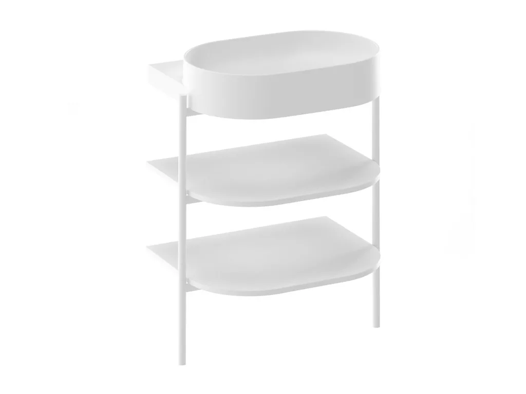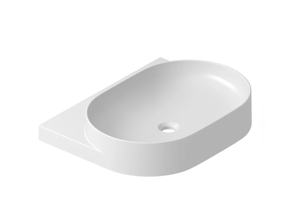 Vékonyfalú kerámia Yard mosdó a Yard konzolhoz vagy a CS Yard 60 mosdó alatti szerkezetre szerelhető, amely nyitott polcos bútordarabként szolgál, túlfolyó nélkül. Fehér kivitel. Lyukkal álló csaptelephez.
