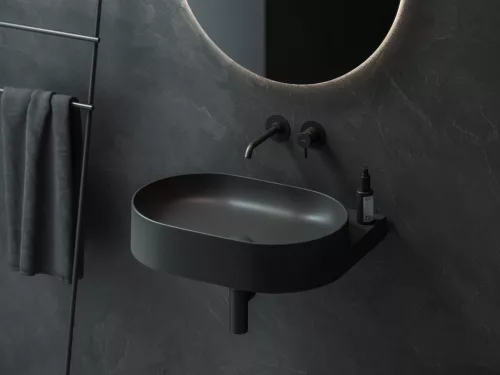Vékonyfalú kerámia Yard mosdó a Yard konzolhoz vagy a CS Yard 60 mosdó alatti szerkezetre szerelhető, túlfolyó nélkül. Matt fekete kivitelben. Lyuk nélkül - beépített mosdócsaptelep kombinációjához.