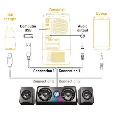A legnagyobb előnyöm azonban az egyszerű vezérlőelemek, amelyeket még egy gyerek is képes kezelni. A minőségi hangzást egy 3,5 mm-es audiocsatlakozó biztosítja, amelyet egyszerűen csatlakoztathatsz a számítógép aljzatához. Ugyanez a helyzet a hangerőszabályzóval is, amelyet a mélysugárzó elején található nagy gombon keresztül vezérelhetsz. Az áramellátásról ezután egy USB-kábel gondoskodik, amely összeköti a hangszórókat és a számítógépet. Szóval csatlakozz és élvezd a zenét!