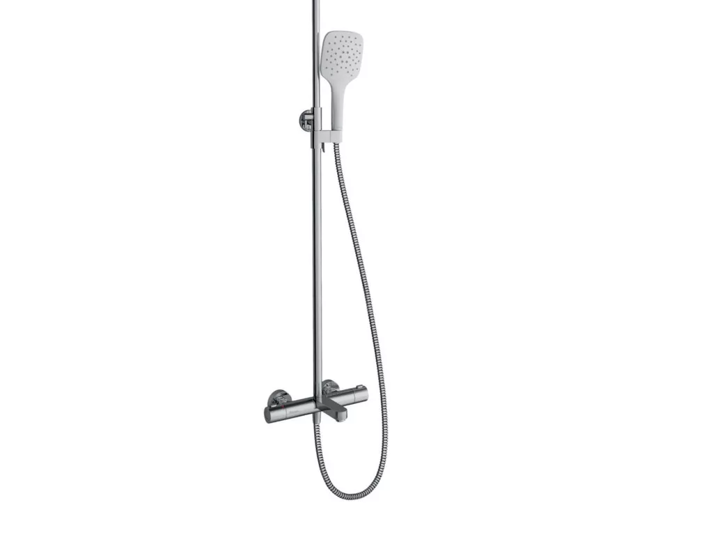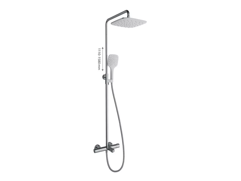 Termo zuhanyoszlop zuhanykészlettel. Fényes króm kivitelben, fehér fejzuhannyal. Állandó vízhőmérséklet beállítása.