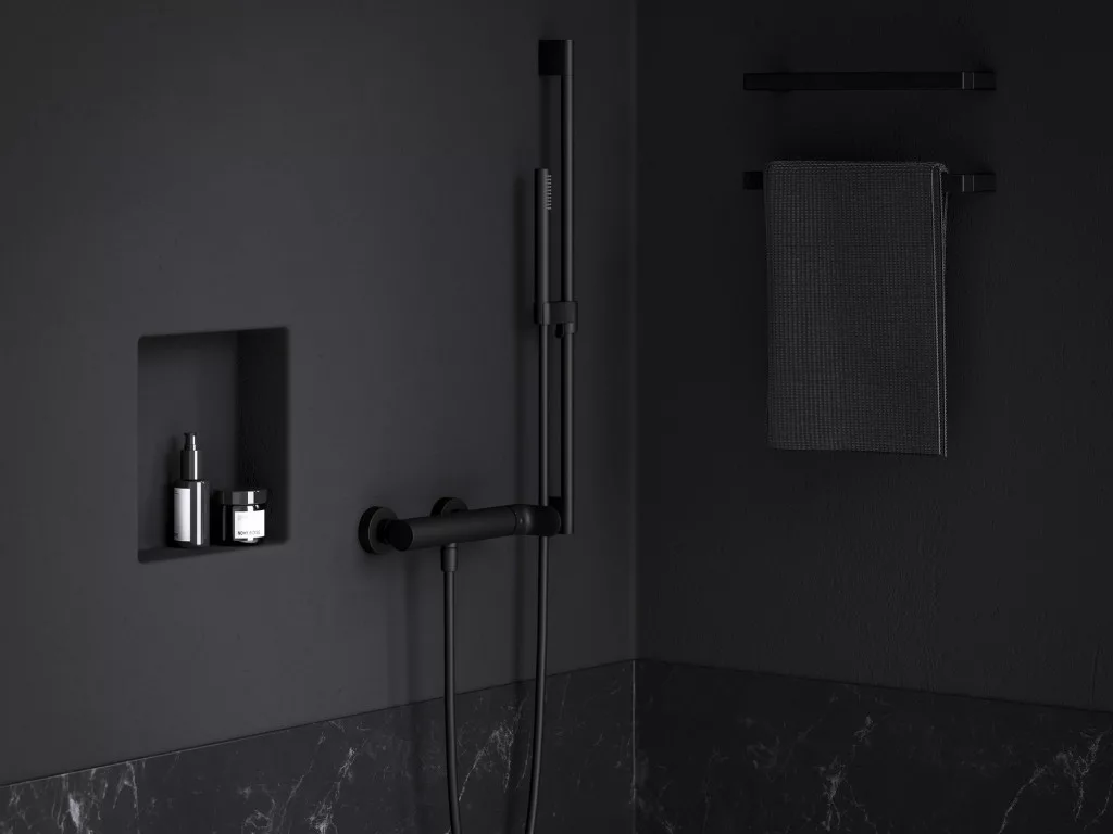 Eleganta fali zuhanycsaptelep, szett nélkül. Matt fekete kivitelben. Süllyesztett perlátor.