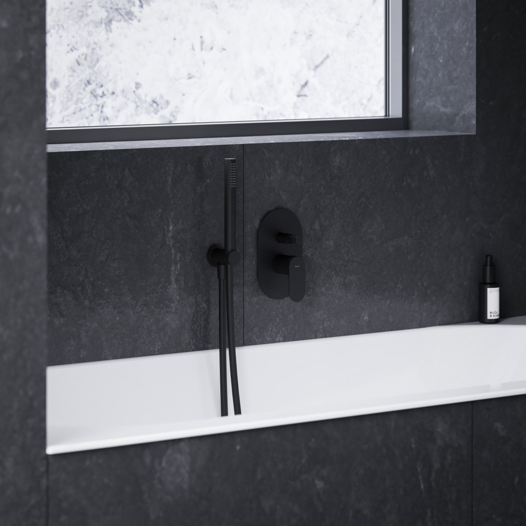 Eleganta falba süllyesztett 2-utas csaptelep. Matt fekete kivitelben.
