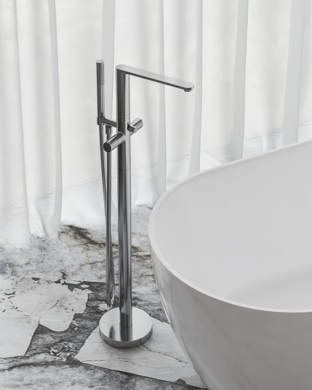 Chrome II padlóba építhető kádcsaptelep zuhanyszettel, R-boxhoz tervezve. Króm kivitelben.