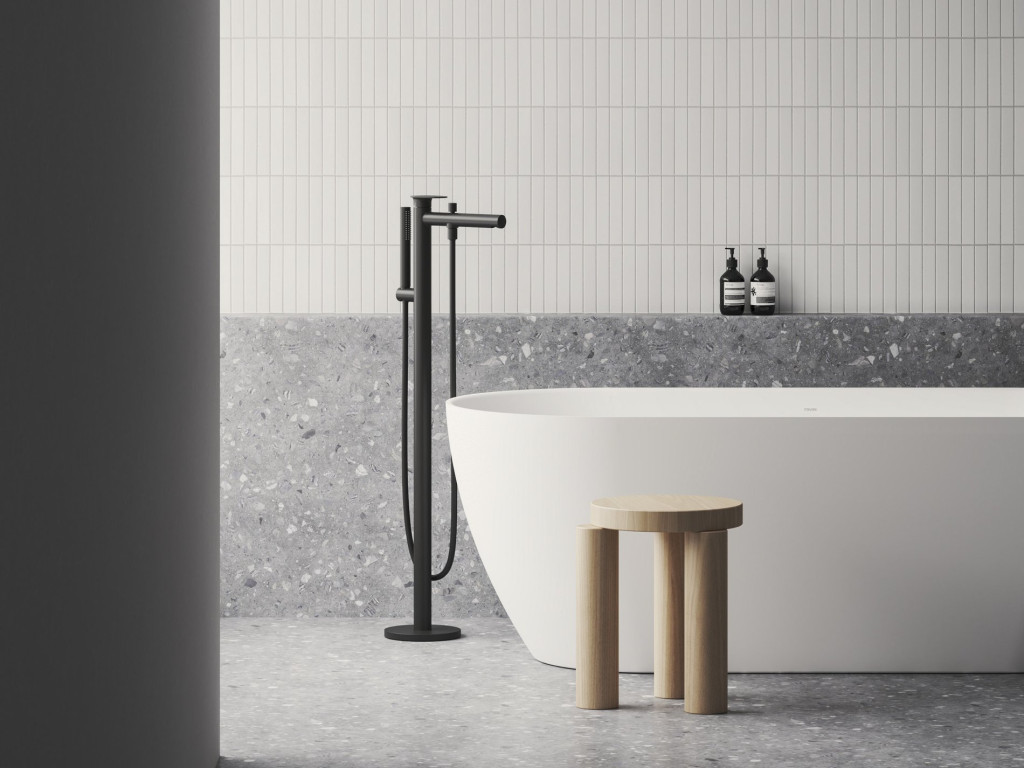 Spring padlóra szerelhető kádcsaptelep, zuhanyszettel, R-box rendszerhez. Matt fekete kivitelben.